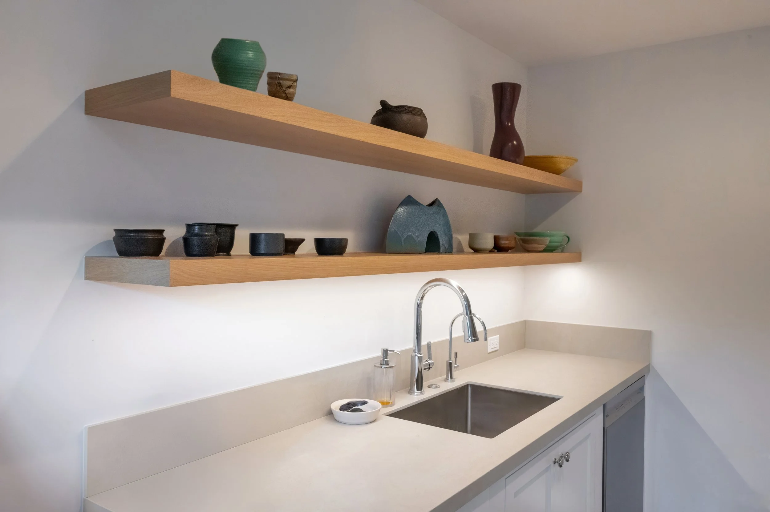 The kitchen was gutted entirely and rebuilt from the ground up. Open floating shelves replace upper cabinets, keeping the space light and accessible. Under-counter refrigerators free up wall space and reinforce the studio's uncluttered aesthetic. Caesarstone concrete countertops — dense, durable, and virtually indestructible — were chosen deliberately for a space that doubles as a working surface. The rest of the dwelling was refreshed with a quiet hand, updating without overworking.